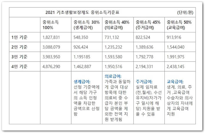 다음 기준표에 의해 중위소득으로 구분을 합니다. 여기서 말하는 중위소득이란 우리나라 정부에서 인정하는 경제적인 소득의 중간 값이라고 판단하는 소비능력을 말합니다.